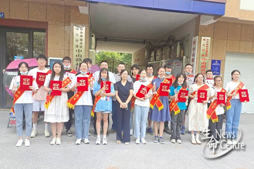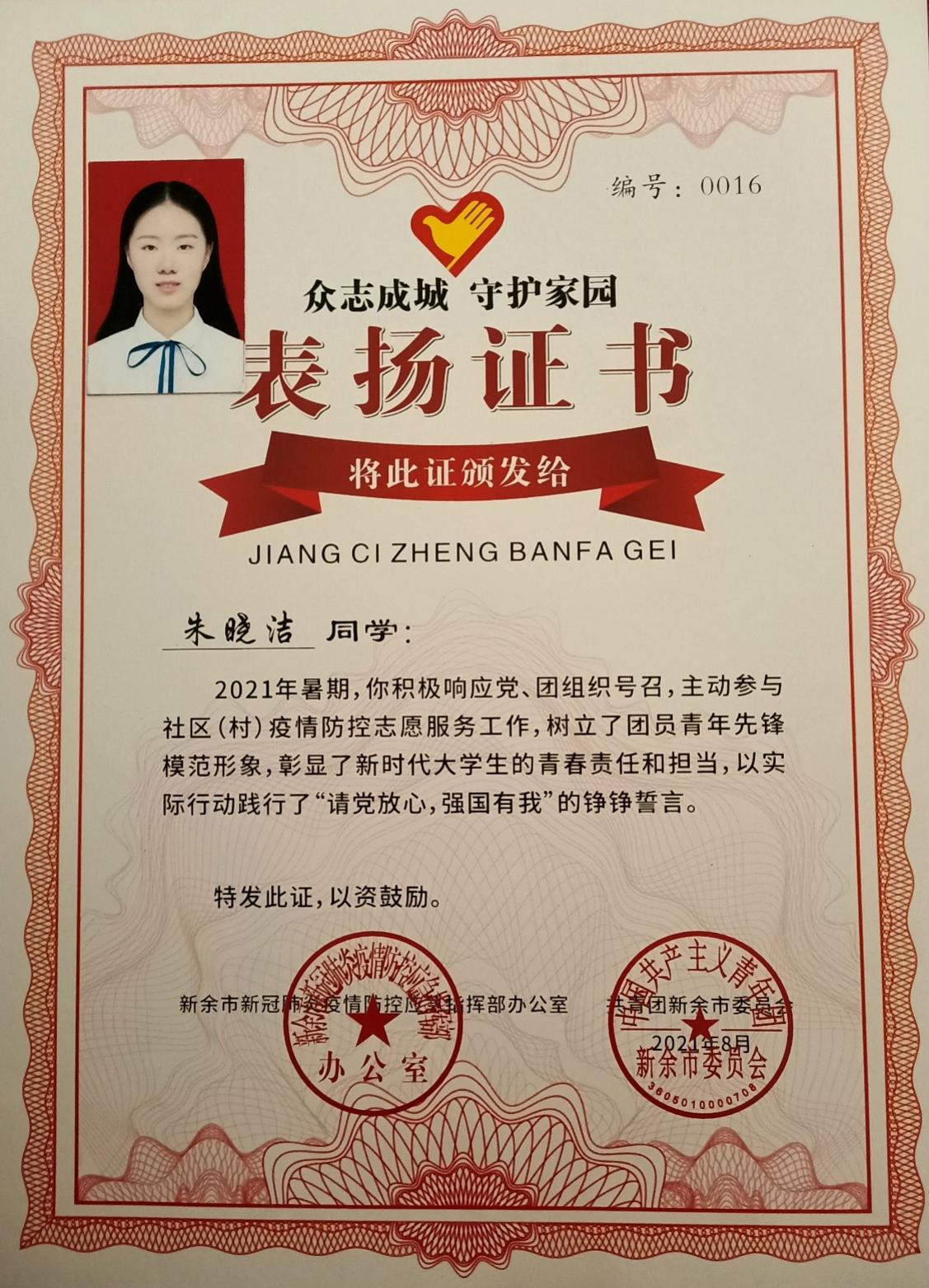 在暑期疫情卷土重来之际,为响应当地防疫号召,朱晓洁同学主动走上抗疫一线,担任社区防疫工作志愿者,十几天如一日地对外来人员进行必要的信息登记、查验健康码和行程码、测量体温等,同时向当地居民宣传疫情防控知识。朱晓洁同学在烈日暴晒和风吹雨打的恶劣天气下,没有任何怨言,仍然连续数天坚守岗位,冲锋在疫情防控一线。在工作中,面对部分居民的不理解不配合,她耐心地科普、劝说和引导,未曾有半句抱怨。正如表扬信中所说:“她用实际行动抗击疫情,树立了青年先锋模范形象,彰显了新时代大学生的青春责任和担当,用行动践行‘请党放心,强国有我’的铮铮誓言。”