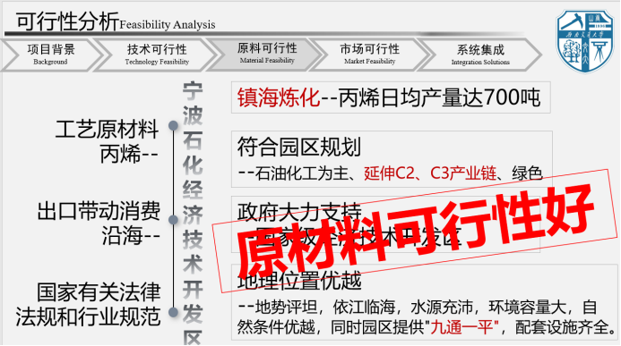本项目依托宁波石化炼海镇化镇海炼化丙烯生产资源,采用当前成熟可靠的丙烯水合法生产异丙醇工艺。本项目厂址所在宁波经济技术开发区条件优越,原料供应可靠,运输距离短,交通运输便利,政策优惠多,产品就地销售,提供给下游油墨、涂料和制药工业等作为生产原料。在工艺上,本项目分为丙烯水合反应工段、丙烯分离工段、提纯工段、萃取剂回收工段、副产物生成工段。在反应工段,反应器出接受外加丙烯同时还接受来自丙烯回收工段中一二级丙烯分离塔(T0101A、T0101B)塔顶产生的回流丙烯,可提高丙烯的利用率,反应器单程转化率为99.02%,选择性为97.00%。提纯工段采用萃取精馏技术,使得各组分易于分离具有能耗低、污染少等优点。采用连续精馏并对萃取剂进行循环回收,提高萃取剂的利用率,降低经济成本。过程节能方面,在流程模拟的基础上进行换热网络设计,装置能耗大大降低。同时本项目通过浓硫酸催化脱水作用在副产物生产工段亦可生产出符合国家标准的丙烯,可供循环利用,使该工艺具有节省原料的特点,大大减少投资成本。设置全厂中央控制室,采用集散控制系统(DCS)和安全仪表系统(SIS)对全厂的生产装置及与工艺生产装置相配套的公用工程部分进行监控,对主要生产装置实施集中监视和控,对辅助装置实施岗位集中监视和控制,保证生产质量保障和安全保障。在生产过程中减少“三废”排放,执行国家和地区的有关环保政策,对生产中的“三废”进行预处理,符合中国制造2025要求,可以实现绿色而可持续生产。