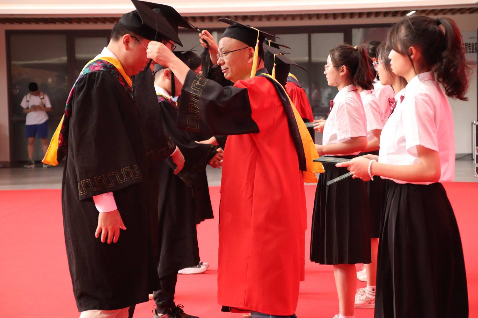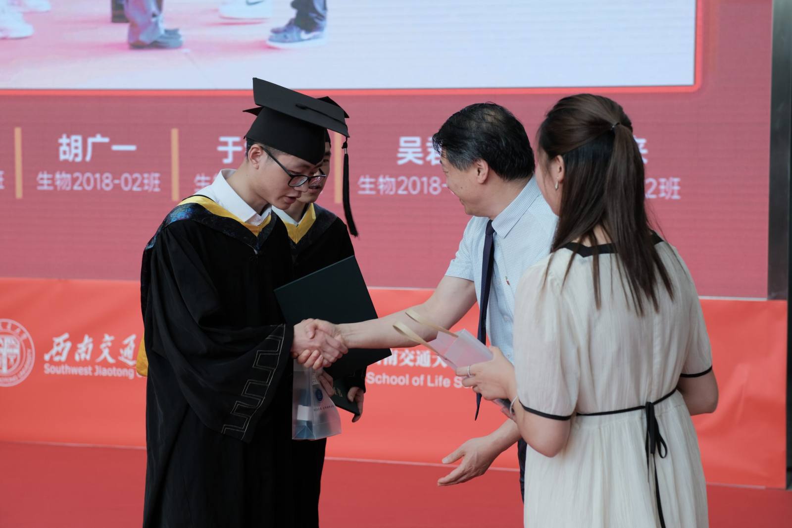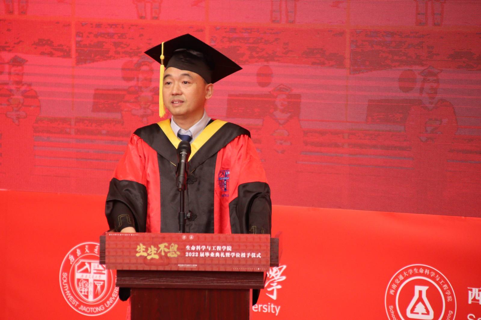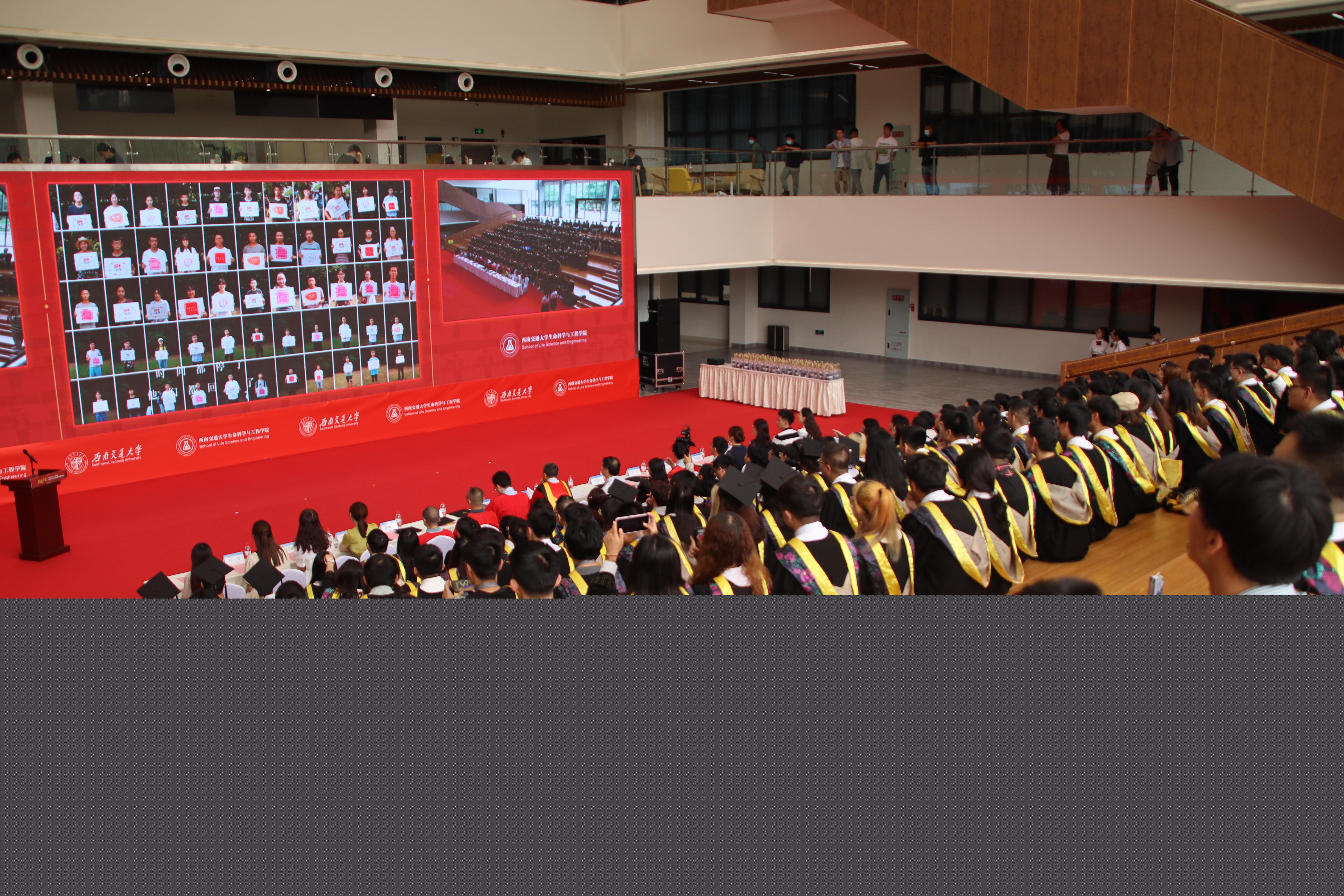 在犀浦校区三号教学楼一楼下沉广场举办2022届毕业典礼暨学位授予仪式。学院党委书记葛永明、院长周先礼等院领导与全体毕业生一起现场参加典礼。由于疫情未能返校的部分毕业生和亲友通过观看图文直播的方式线上参与典礼。典礼由吴亦鸣同学主持。