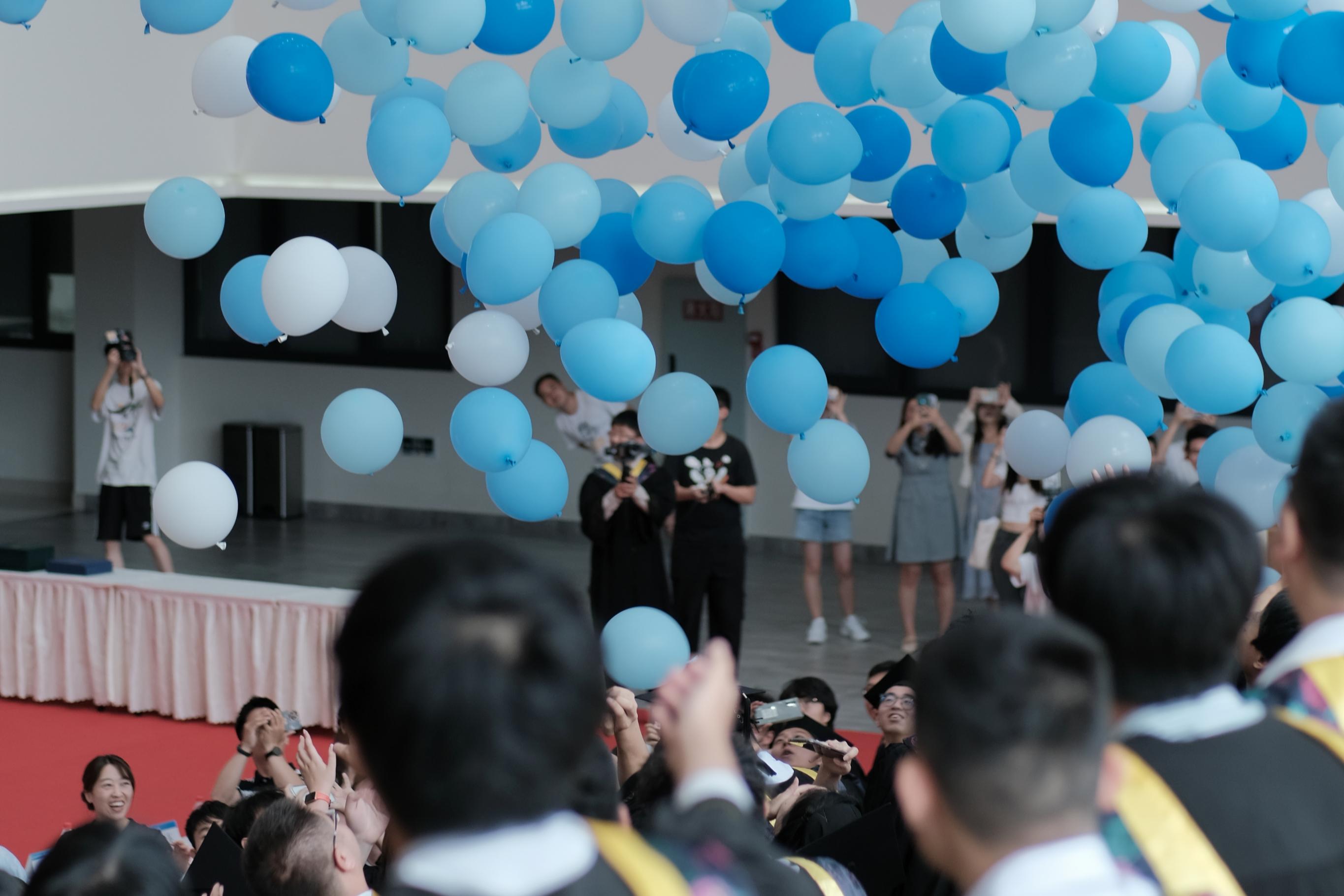 仪式尾声,辅导员胡慧怡和毕业生代表精心准备了歌曲快闪。《入海》、《记念》、《如愿》、《有我》等歌曲寄托了老师和同学们的美好期望和祝福,现场气氛欢快热烈。快闪环节的最后,全体毕业生齐唱《不说再见》,既向过往的校园生活说再见,又饱含对同学情谊、师生情谊、校友情谊的铭记与珍藏。随着一声“毕业快乐”,几百个气球从天而落,将典礼推向高潮,授位典礼圆满结束。