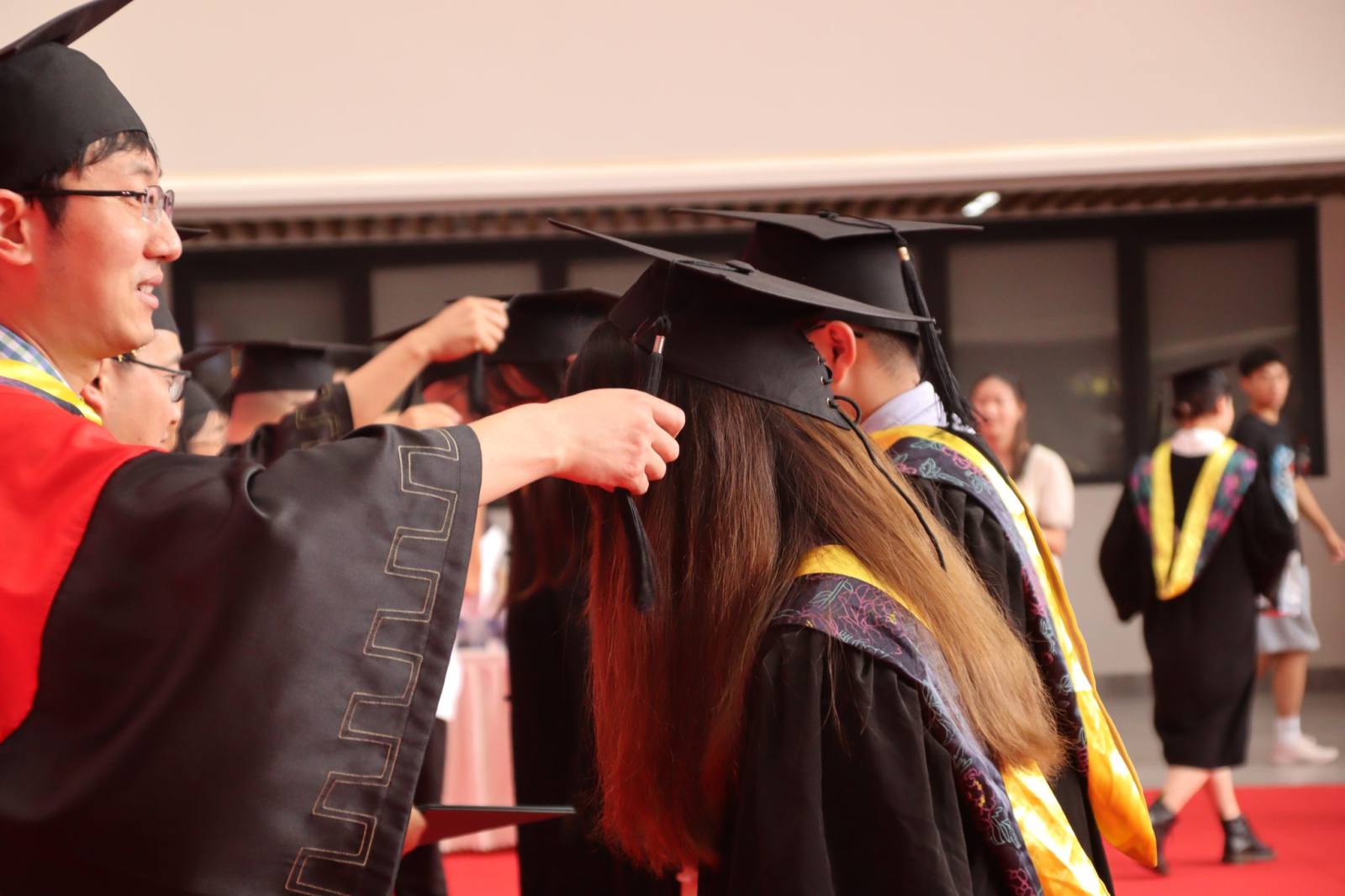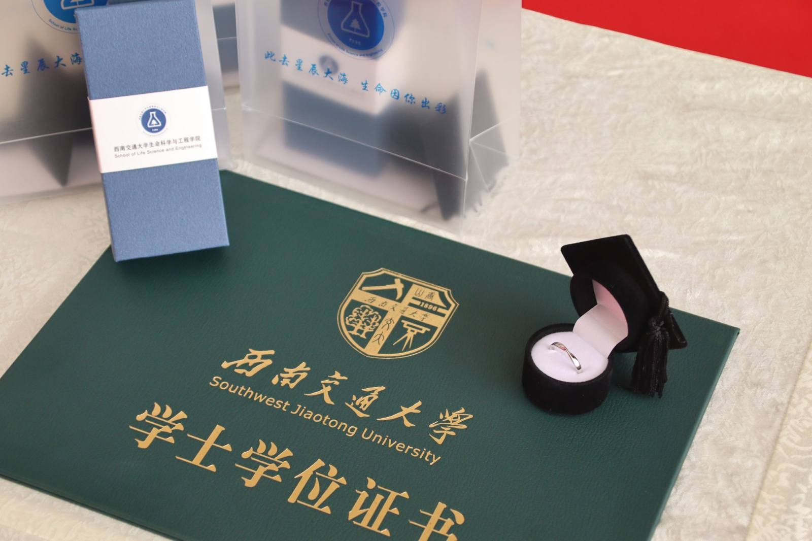 毕业生们整理着装,依次上台,周先礼、李遂焰、高峰、万军、黄新河、茆灿泉、陆群分别为毕业生拨穗授位,见证毕业生们这一荣耀又神圣的时刻。葛永明一一为毕业生赠送带有学号的“生命最美戒”和院徽的U盘。毕业礼物袋上印刷的“此去星辰大海 生命因你出彩”饱含学院对毕业生的最美好的祝福。