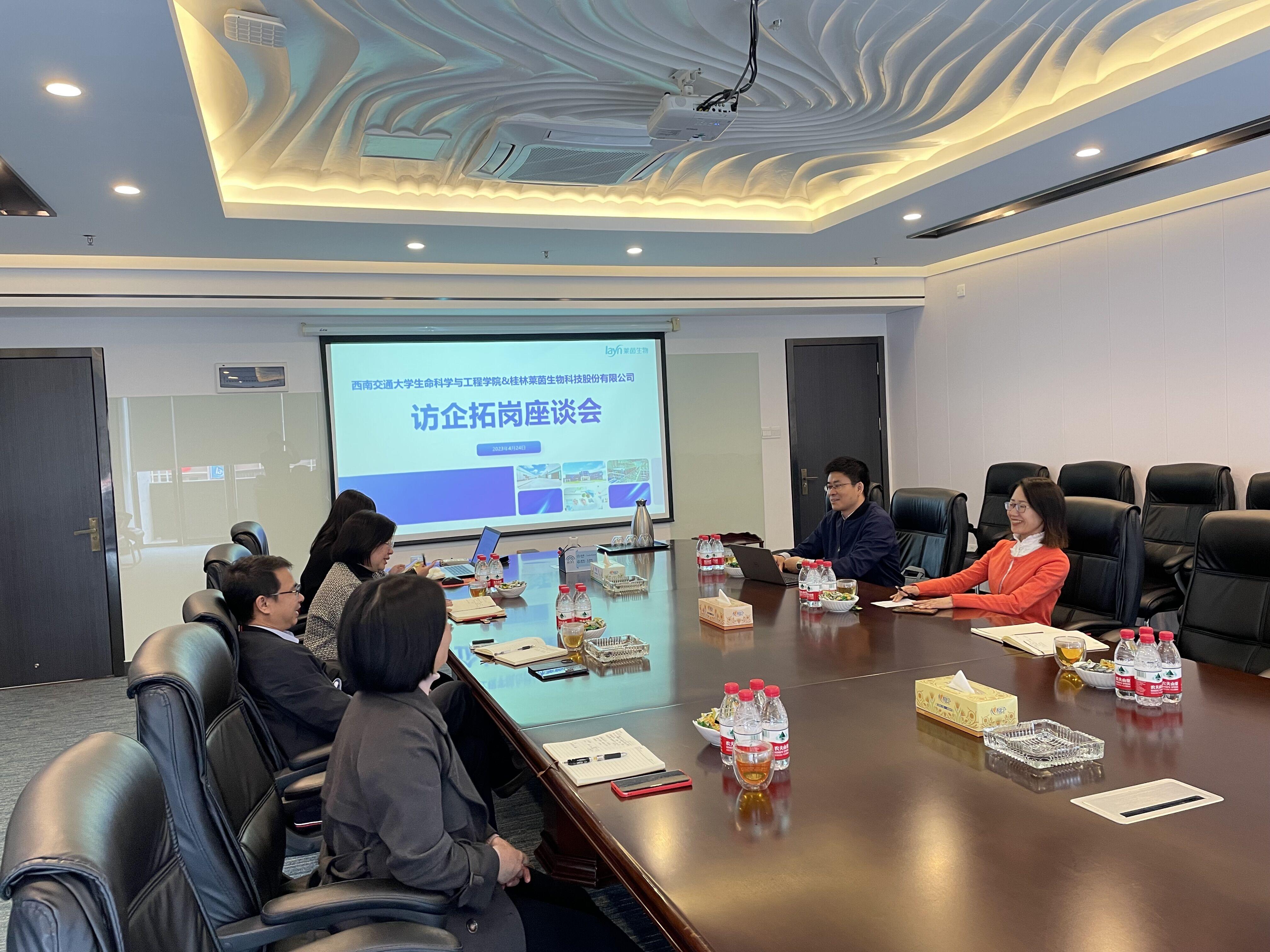 4月24日上午,李卓慧一行走进桂林莱茵生物股份有限公司开展访企拓岗、校企对接活动,与公司董事会秘书、副总经理罗华阳、人力资源主管文佳琳、人力资源经理易桂青和高校毕业生招聘专员余旨惠进行交流。李卓慧一行人介绍了学院毕业生情况,了解莱茵生物公司对毕业生的招聘需求,并对今后进一步推进学生实习实践、生涯教育等方面进行了沟通交流。