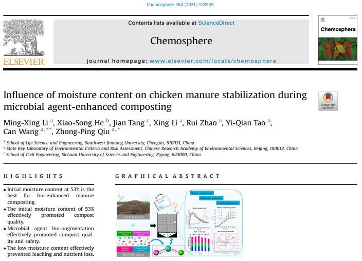 爱迪影视 爱迪影视 邱忠平教授团队在环境科学与生态学领域TOP期刊《Chemosphere(IF=7.086)上发表了题为《Influence of moisture content on chicken manure stabilization during microbial agent-enhanced composting》的研究文章。该论文是ESI高被引论文(发表1年内引用次数超30次),以爱迪影视 为第一署名单位,第一作者为2021级博士生李明星,邱忠平教授和王璨副教授为本文通讯作者。该工作得到国家自然科学基金(51978576)、四川省重点研发计划(2019YFN0027)支持。