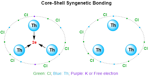 首先,研究者提出了一种新型的“核-壳共生键模型”来描述Th3Cl6笼状中心的化学键。具体而言,除去与配体形成配位键的2个电子外,钍金属中心(Th6d27s2)可提供2个价电子参与形成Th3Cl6笼状物。因氯原子吸电子能力强,三个钍金属中心的6个价电子全部被六个氯原子夺去,进而使得Th3金属簇内部没有剩余的电子可形成化学键(如2右所示)。然而,通过引入两个钾原子或自由电子,外部Cl6基团将释放两个电子在Th3金属簇内部形成化学键 (如2左所示)。由此可知,-壳共生键模型由内部小分子金属簇形成的3c-2e金属键 (Th3) 和外部涉及12个电子的多中心电荷转移键 (ThCl2)3组成。 为进一步揭示 -壳共生键”的形成机理,我们使用原位轨道相关图演示了Th3金属簇与外部Cl6基团的轨道相互作用 (见图3)。