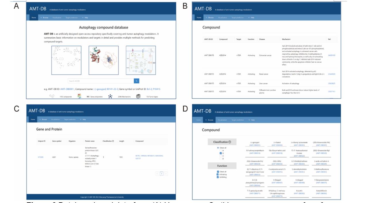 为了实现这一目标,符雷蕾研究小组合作开发了一个自噬调节剂综合数据库(AMTDB,//amtdb.vercel.app/)。 AMTDB包括153种癌症类型,1153种调控自噬的化合物,860个靶点和2,046个相关机制或信号通路。此外,还提供了多种分类方法、高级检索和目标预测功能,以满足用户的不同需求。