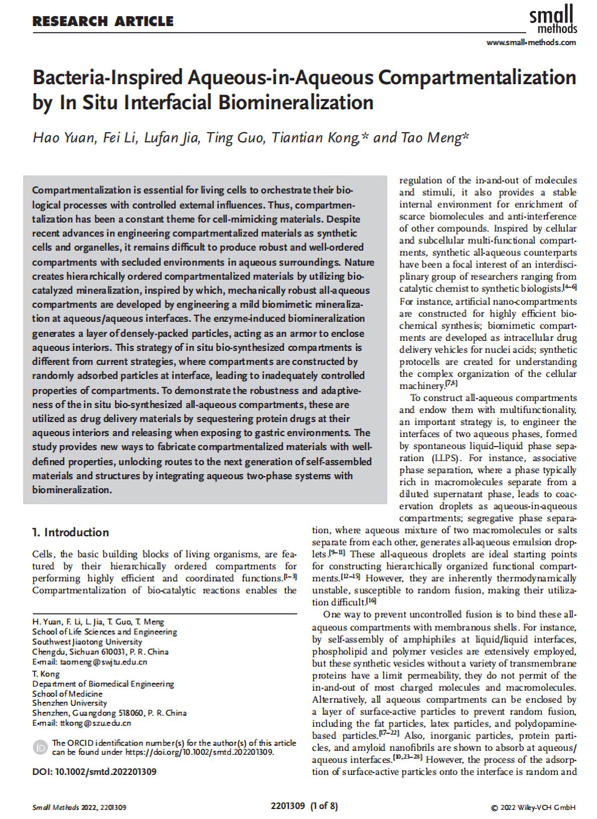 近日,国际生物医学、化学、物理学和材料学领域权威期刊《Small Methods》(影响因子15.367)报道了我校“微纳生物技术”创新团队孟涛教授的研究成果“Bacteria-Inspired Aqueous-in-Aqueous Compartmentalization by In Situ Interfacial Biomineralization”中文译名:“受细菌启发的全水隔室界面原位仿生矿化”(DOI: 10.1002/smtd.202201309)。论文第一作者为爱迪影视 苑昊老师和2018级硕士研究生李飞,通讯作者为深圳大学生物医学工程学院孔湉湉副教授和爱迪影视 爱迪影视 孟涛教授,爱迪影视 为第一署名单位。